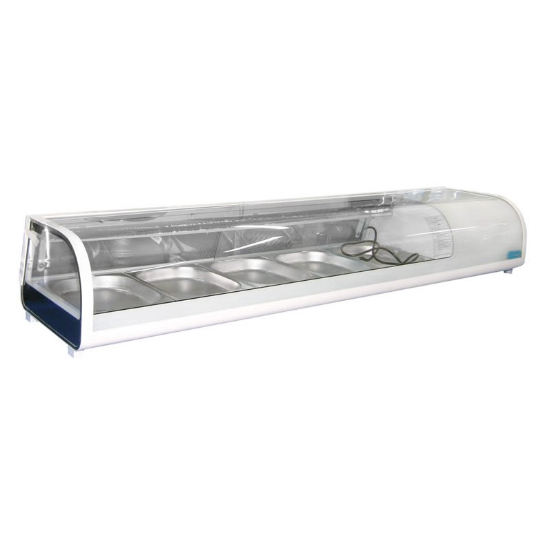 Vitrina refrigerada para sushi. Sobre mostrador con 5 charolas gastronom de ½, color blanco con cristal curvo, serpentín superior y charola fría, iluminación con leds.